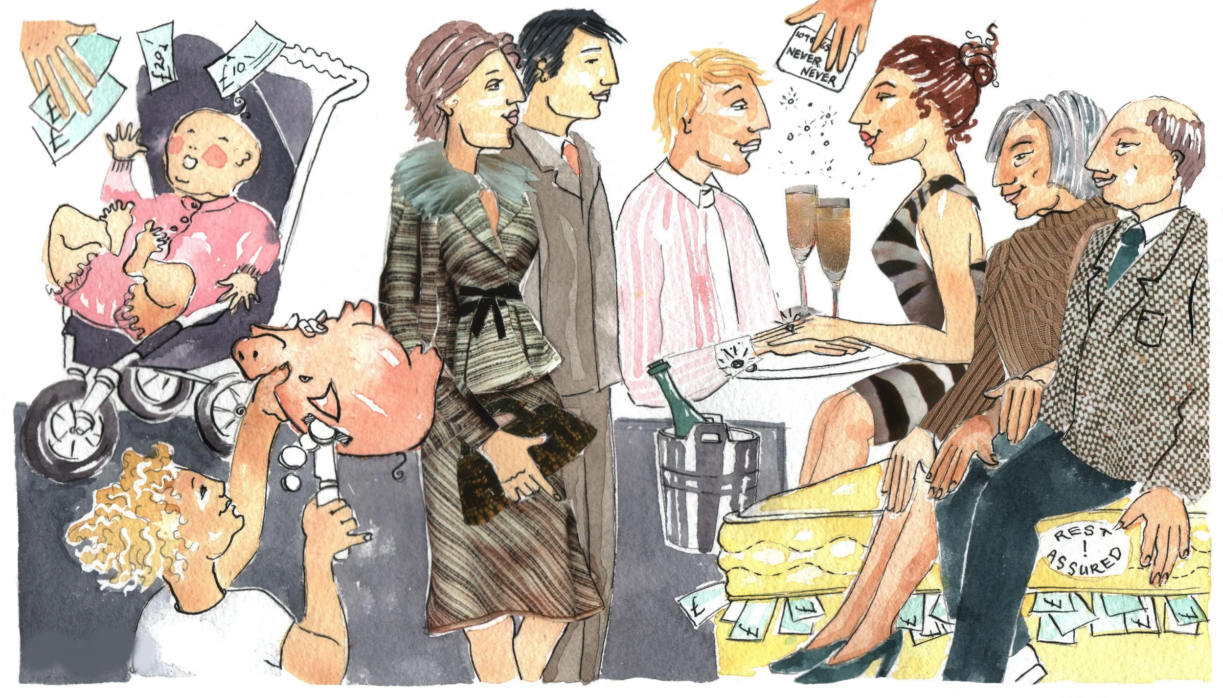 Dip pen line with watercolour wash and photo montage.